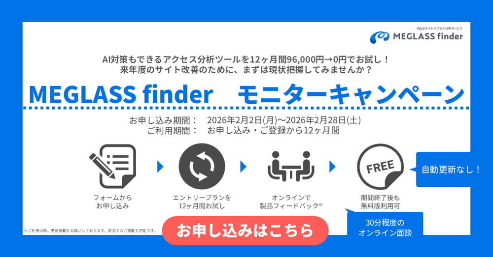 この度MEGLASS finderは、通常96,000円のエントリープランを無料で12ヶ月間お試しいただける「モニターキャンペーン」を実施いたします! アクセス分析、AI SEO分析、簡易アクセシビリティ分析などの多角的な分析メニューをご利用いただくことで、サイト改善のための課題把握を効率的に行えるキャンペーンです。 サイト運用業務を効率化したい、サイトをどこから改善すべきかわからないという方はぜひご活用ください。